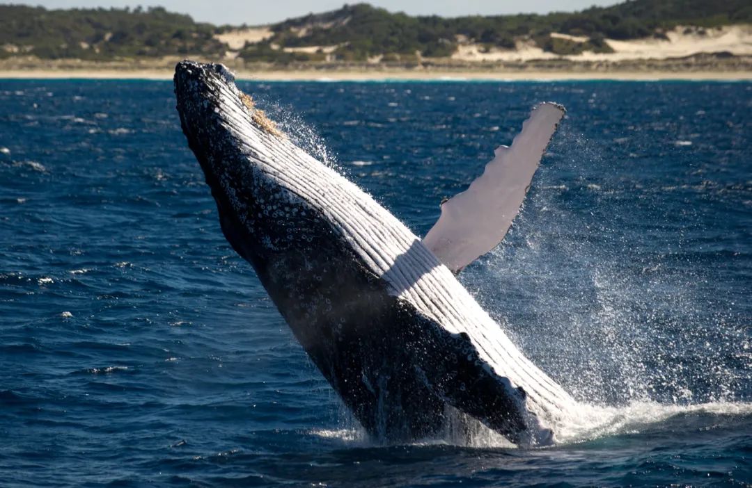 在澳大利亚昆士兰州布里斯班市附近的莫顿角水域,一只座头鲸在水中嬉戏。新华社发(白雪摄)