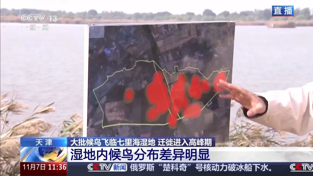 这里是天津市宁河区的七里海湿地内。通过画面可以看到,有不止一群鸟类正在远处的水面停歇。根据工作人员辨认,至少有白琵鹭、小天鹅、反嘴鹬等多种候鸟。每当迁徙季开始,我们对于候鸟的关注就一直在持续。从前几天拍摄到的画面可以看到:平静的水面上,候鸟们休息时挨挨挤挤聚成一团;而在觅食时,它们则三三两两地四散开来,有的悠闲漫步,有的将脑袋扎进水中寻找食物。